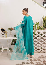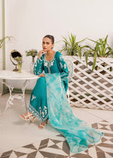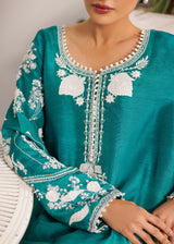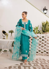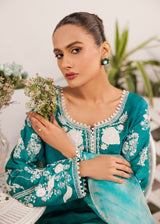 Saahil features a serene teal ensemble inspired by the quiet elegance of ocean shorelines. This three-piece set features intricate white embroidery that blossoms across the bodice and sleeves, beautifully adored with hand embellishments, balanced by a breezy aqua tie-dye chiffon dupatta.The shirt’s classic straight silhouette and rounded neckline makes it versatile. Paired with tailored trousers and a soft, flowy dupatta, it captures effortless grace with a touch of coastal charm.