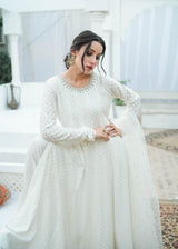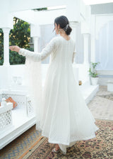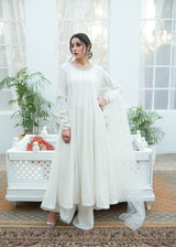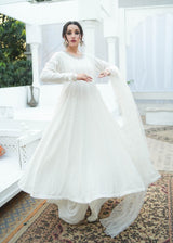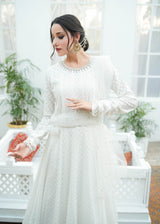 Safah is an all white three piece ensemble. The dress features a flared silhouette with a soft chevron self-texture that adds minimalist charm. Full-length sleeves and a round neckline offer a modest, graceful shape, while the neckline is gently hand embellished to give the highlight. Paired with wide leg pants , this dress is a perfect piece for any formal occasion.
