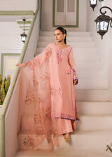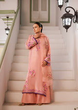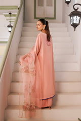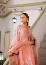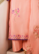 Gulzaar features a refined peach-toned ensemble. This three-piece suit features a straight-cut raw silk shirt in soft peach, detailed with multicolour resham hand embroidery concentrated along the neckline, sleeves and scattered floral bunches throughout the shirt front paired with block printed organza dupatta. The ensemble is completed with peach-dyed raw silk trousers in a wide-leg cut, offering both comfort and structure.