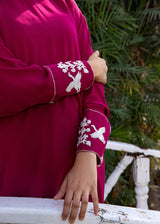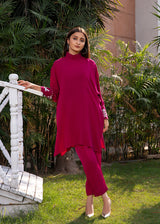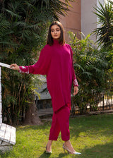 This beautiful pink top with turtle neck has very delicate hand-embroidered cuffs with kora, sitara and resham. It is paired with straight pants.