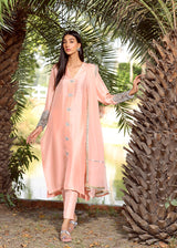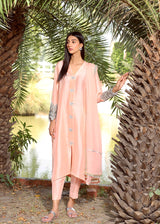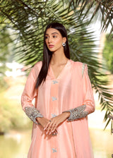 This peach pure raw silk front opened shirt has been hand embroidered flamingos in front and detailed work on the sleeves cuff in silver zardozi and resham.