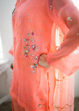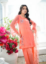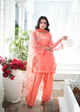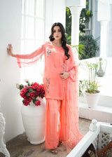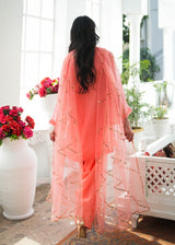 Gul Rang is a coral stitched ensemble that glows with soft radiance. The shirt is tailored in a lightweight organza fabric with intricate hand embellishments scattered across the bodice, adding a touch of elegance. Paired with a flowy kamdaani dupatta and Farshi shalwar, this ensemble embodies a perfect blend of traditional charm and modern sophistication.
