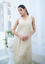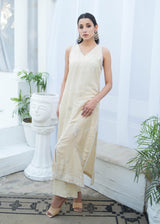 Inaya is a gracefully crafted ivory ensemble that embodies quiet elegance. This piece features delicate mirror hand embellishments that add just the right hint of charm without overwhelming the design. Cut from premium raw silk fabric, Inaya drapes effortlessly, offering comfort and poise in equal measure. The subtle detailing around the neckline and sleeves enhances its refined charm.