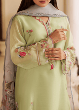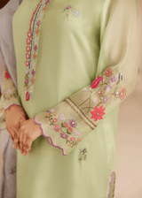 Immerse yourself in the sheer elegance of Delara. This exquisite pastel green kurta set is adorned with intricate embroidery, delicate embellishments, and artisanal details, exuding sophistication with every stitch.