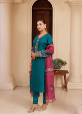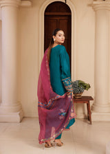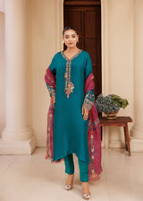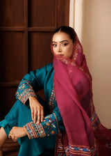 Crafted on a rich teal canvas, Neelkamal is adorned with intricate embroidery in harmonious shades while the complementing dupatta enhances the overall composition with its striking patterns.