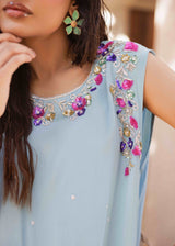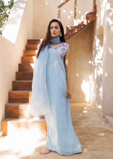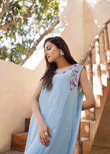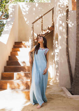 Celeste is a light blue sleeveless maxi dress. The gentle hue is beautifully complemented by floral embroidery that frames the neckline, with a flowy silhouette and comfortable fit, this dress offers a comfortable style for any occasion.