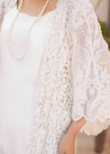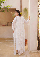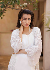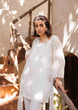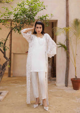 This three-piece set showcases a breathtaking longline jacket crafted from intricate lace adorned with hand-stitched stones. The set includes a minimalist white tunic and tailored white trousers, creating a modern yet comfortable look perfect for making a statement on any occasion.