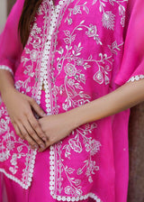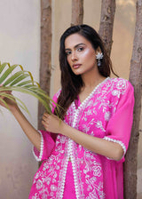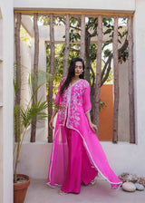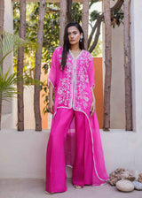 Make a vibrant statement in Pink Cascade. This striking three piece set features a flowy high-low tunic in a bold pink hue, adorned with delicate white embroidery and mirror work. Paired with wide-leg trousers, it creates a dramatic and stylish cascade of color and style.