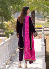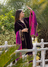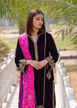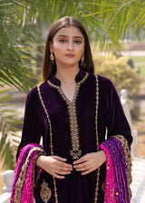 This loose fit, flattering deep plum velvet kurta is fully hand crafted with intricate detailing in antique gold zardori. This irresistible sheen enhances the look paired with raw silk pants and multi-colored chunri. A must-buy for this festive season!