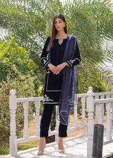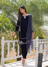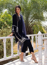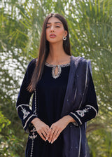 A deep sapphire velvet, classically designed with very delicate hand embroidery in silver zardozi and pink french knots of resham. It is paired with same velvet fitted pants and organza dubata to complete the look. A must have for this season!