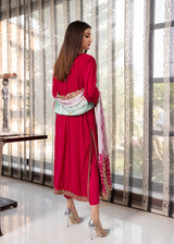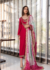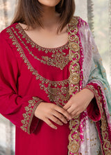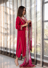 This forever flattering long velvet shirt in hot pink color is adorned with a handcrafted jeweled neckline and borders on sleeves n daman in the antique gold color of zardozi. paired with raw silk pants and multi-color chunri. It will be our immediate choice for a wedding look.
