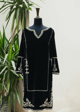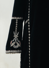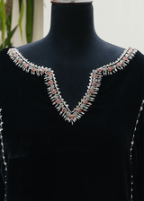 This velvet piece is embellished with fine hand-crafted details, including dapka, naqshi, resham threads, pearls, and shimmering Swarovski crystals for a touch of brilliance.